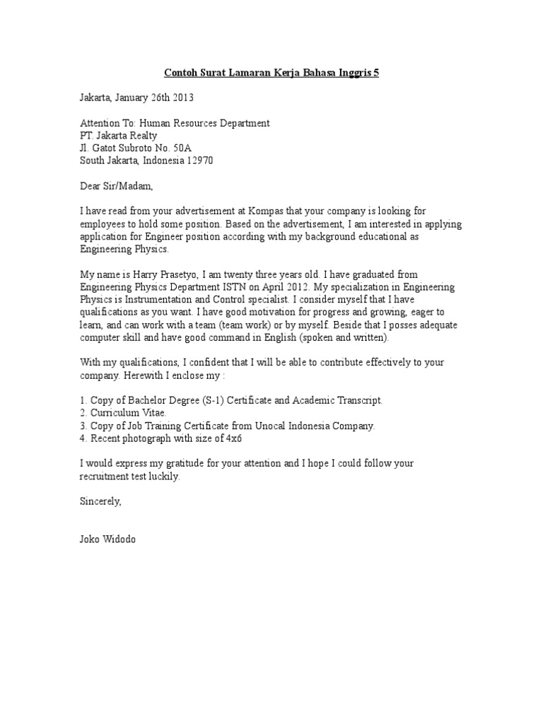 Kelihatannya surat lamaran kerja ini cukup berperan ya? Contoh surat lamaran pekerjaan bahasa inggris berdasarkan iklan dan artinya. Bandar lampung, 3 april, 2015. Surat lamaran kerja dan cv bahasa inggris harus disiapkan secara rapi dan terkesan profesional. Enggak usah khawatir, contoh surat lamaran kerja bahasa inggris di bawah ini bisa membantumu mendapatkan profesi yang sudah kamu impikan sejak lama! Hanya saja terdapat perbedaan dalam penggunaan bahasanya oh iya bila kita belum menguasai betul bahasa inggris ini kita dapat membuat kerangka surat lamaran kerja ini dalam bahasa indonesia baru kita. Berbicara mengenai surat lamaran kerja, anda bisa menulisnya dalam bahasa indonesia dan bahasa inggris. Membuat surat lamaran pekerjaan yang baik dan benar merupakan hal yang wajib dilakukan oleh para pencari kerja. Lb gramedia citra lestari hal : Salah satu trik agar surat lamaran tampil beda dan lebih baik adalah dengan menulisnya menggunakan bahasa inggris, contohnya seperti ini. Surat lamaran kerja biasanya dikirimkan untuk melamar sebuah posisi kerja di suatu perusahaan. Surat lamaran pekerjaan adalah surat yang diajukan oleh seorang pelamar kerja ke pihak instansi atau perusahaan tujuannya bekerja. Pada artikel ini akan saya bagikan beberapa contoh surat lamaran kerja dalam bahasa inggris.